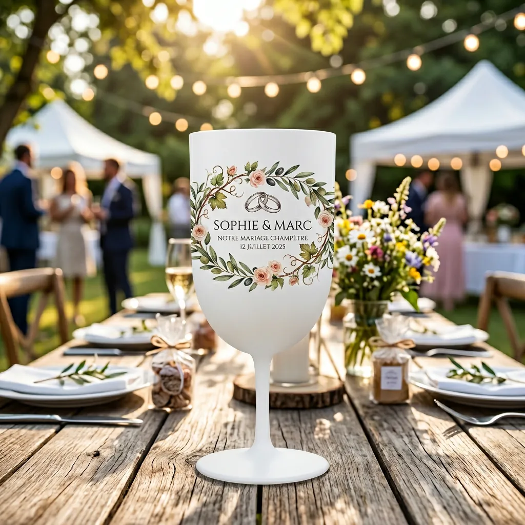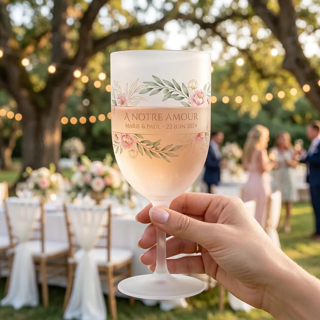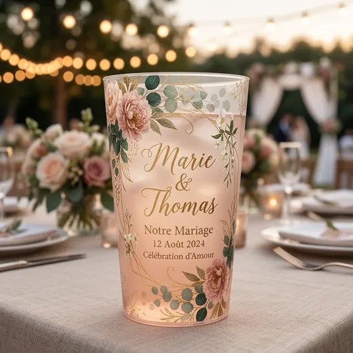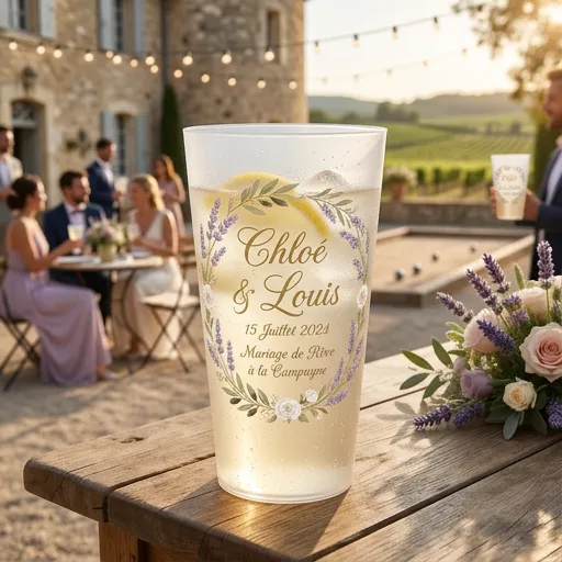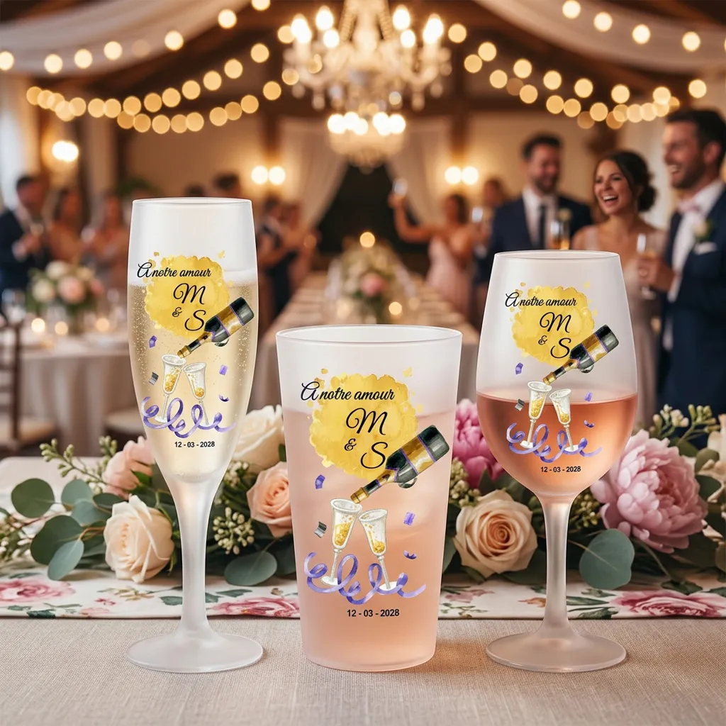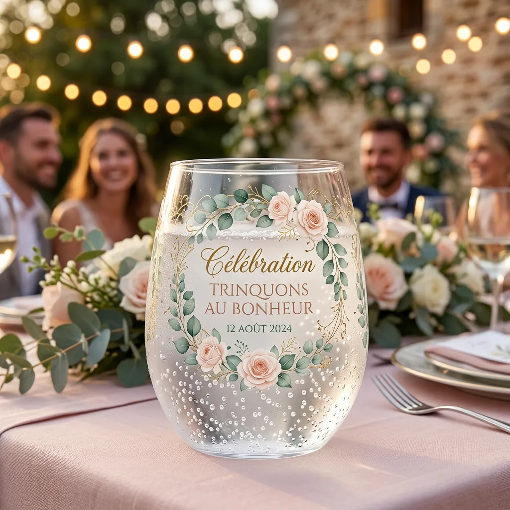 Le mariage chic par excellence : un verre personnalisé aux lignes épurées en noir et or pour une réception moderne et élégante. Ce design tendance 2025 séduit les couples qui aiment l'esthétique graphique sans fioriture. À personnaliser avec vos prénoms et votre date pour un effet luxueux garanti sur chaque table de votre réception.