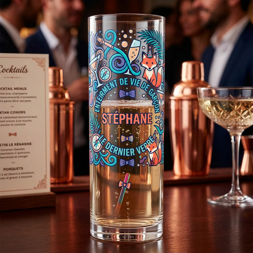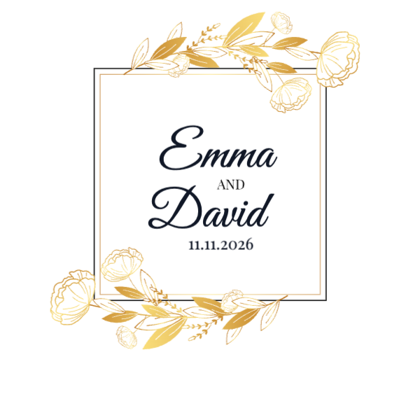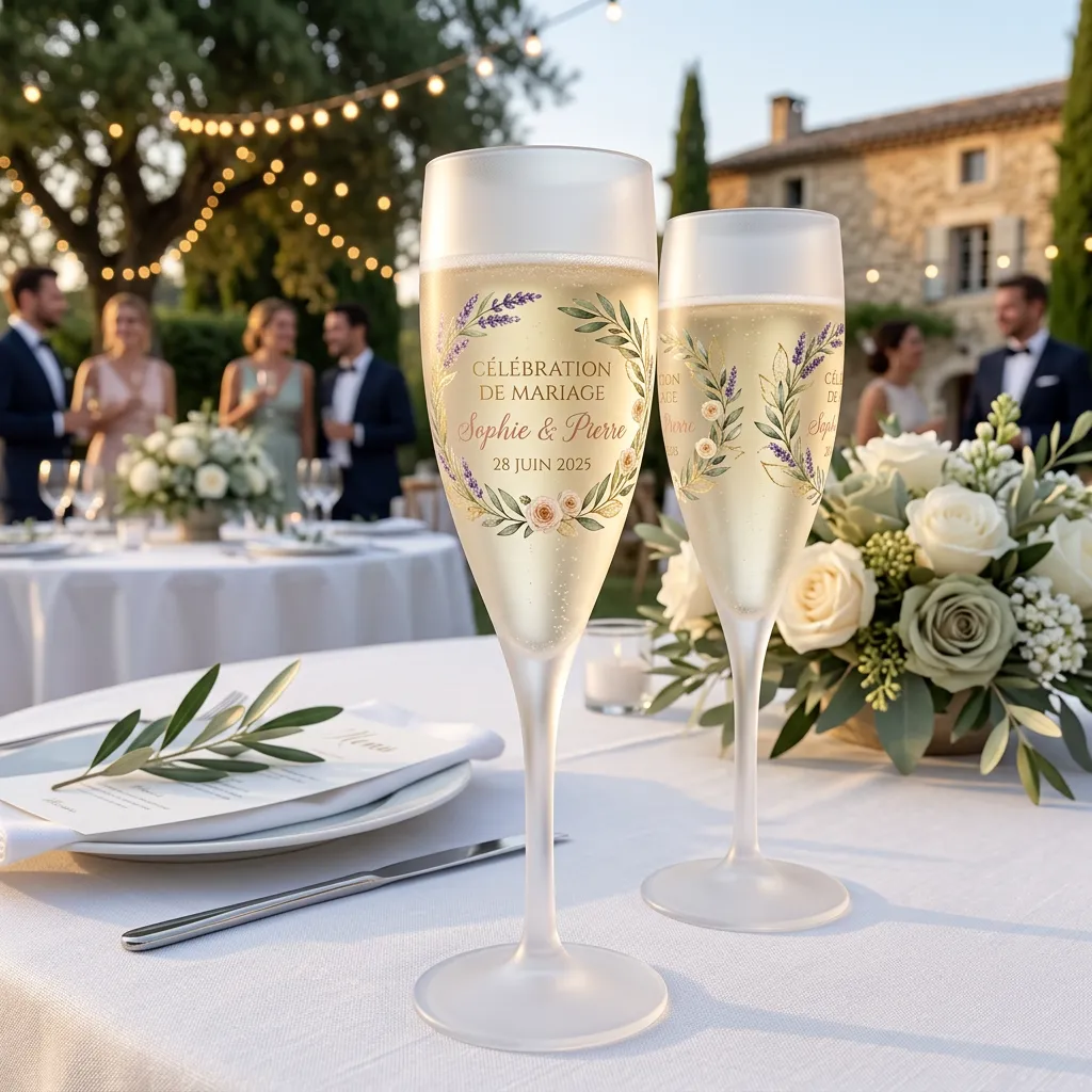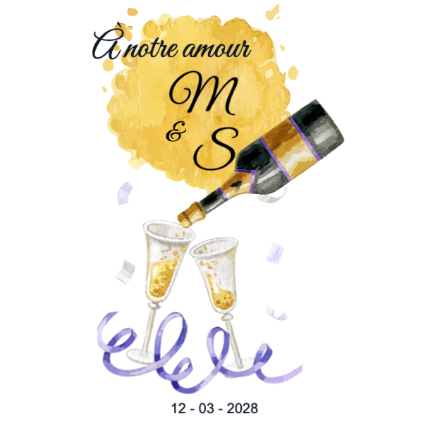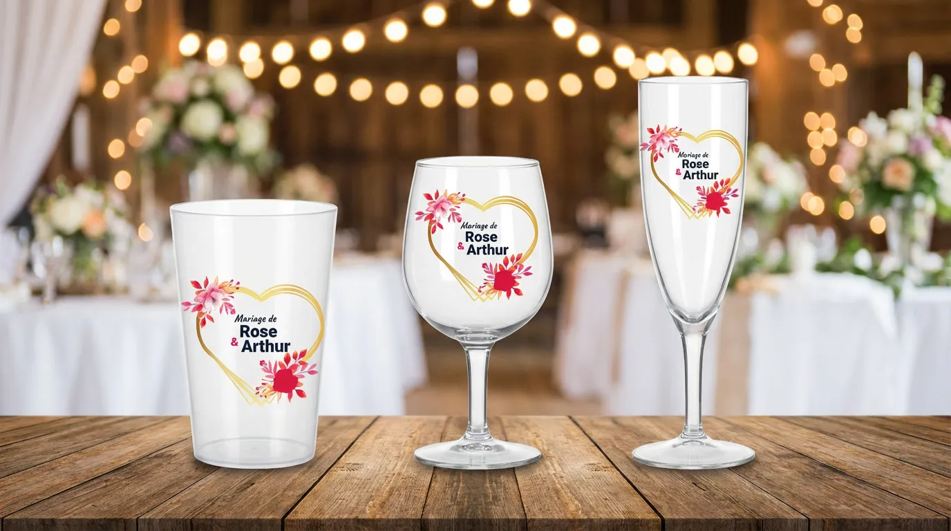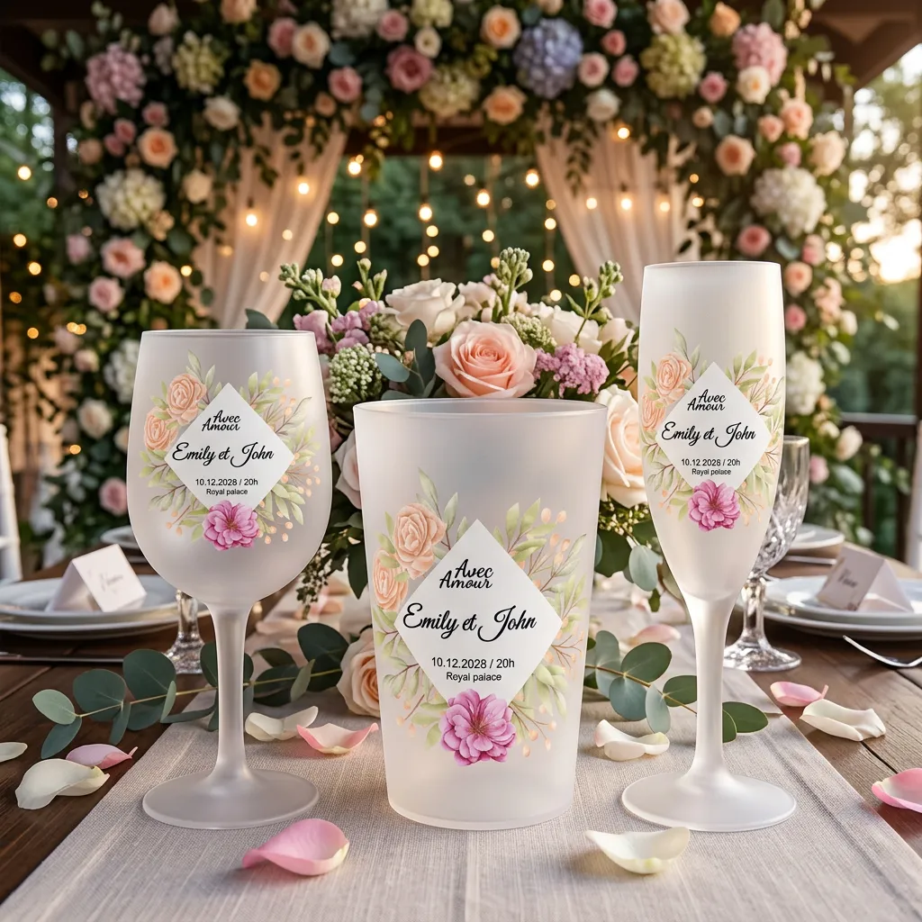 Le mariage chic par excellence : un verre personnalisé aux lignes épurées en noir et or pour une réception moderne et élégante. Ce design tendance 2025 séduit les couples qui aiment l'esthétique graphique sans fioriture. À personnaliser avec vos prénoms et votre date pour un effet luxueux garanti sur chaque table de votre réception.