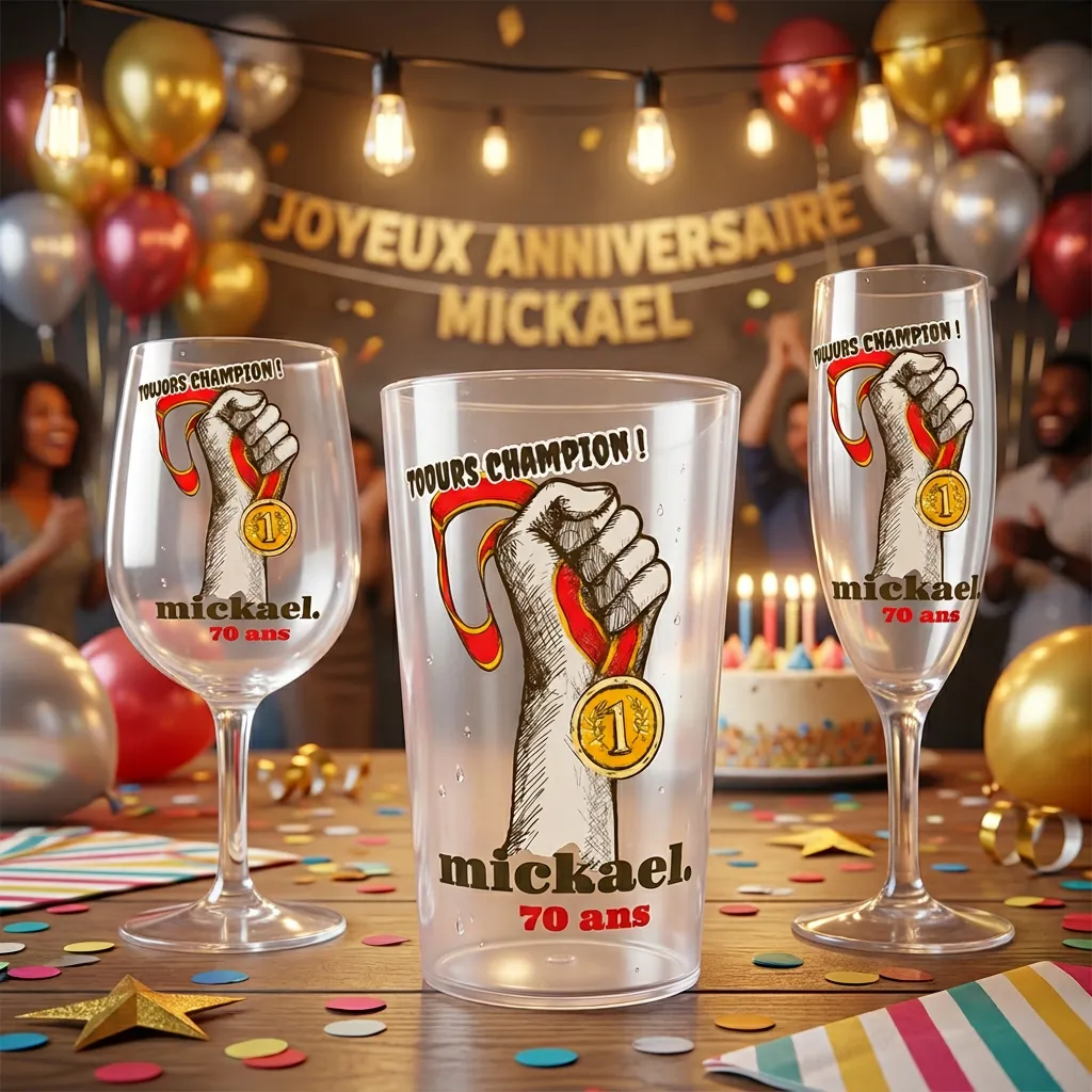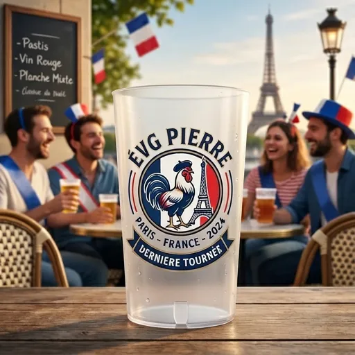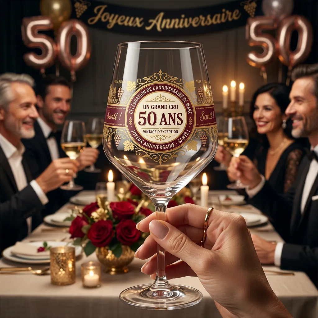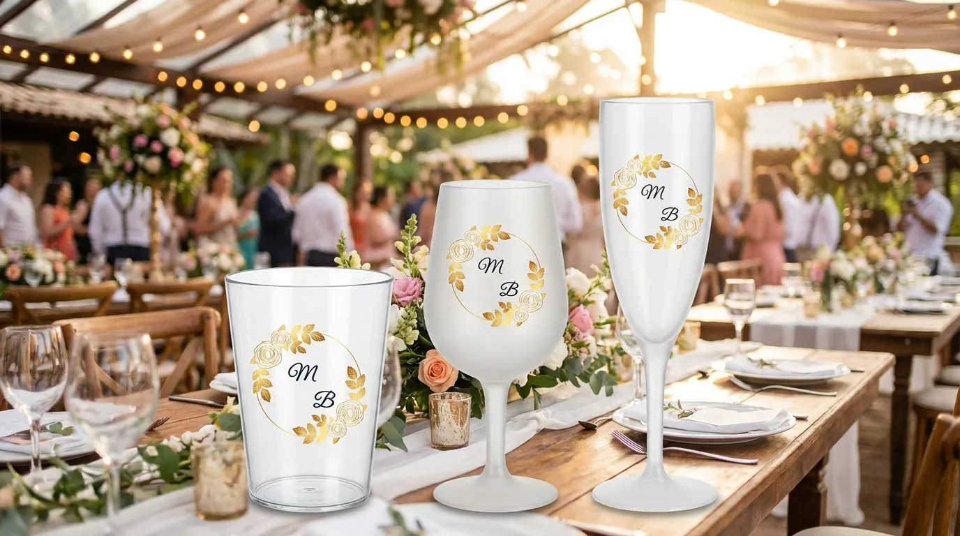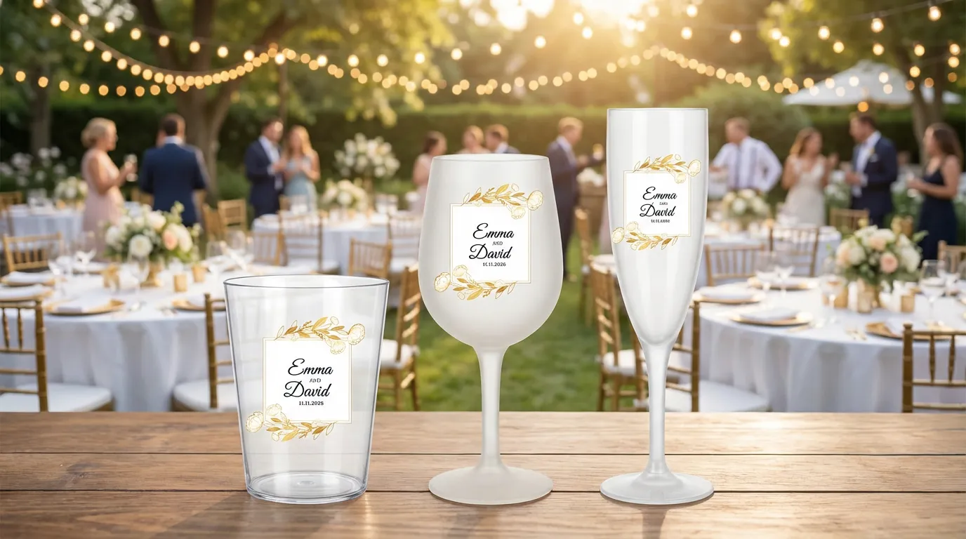 Le mariage chic par excellence : un verre personnalisé aux lignes épurées en noir et or pour une réception moderne et élégante. Ce design tendance 2025 séduit les couples qui aiment l'esthétique graphique sans fioriture. À personnaliser avec vos prénoms et votre date pour un effet luxueux garanti sur chaque table de votre réception.