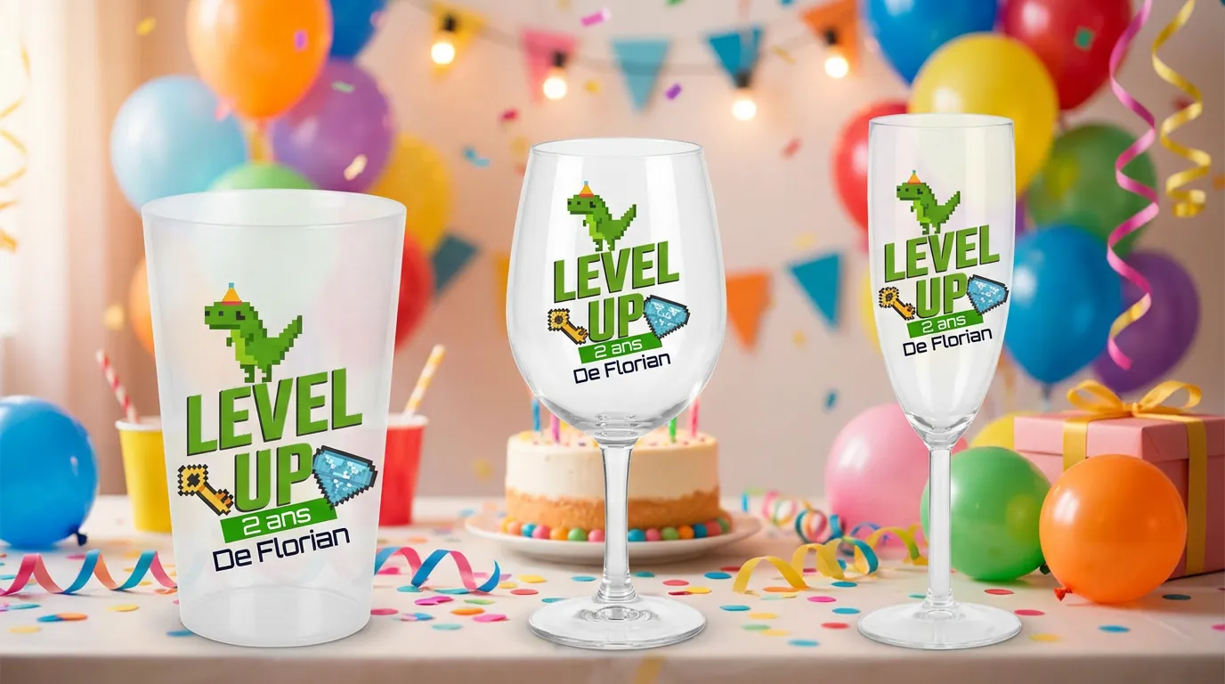 Joueur un jour, joueur toujours ! Ce verre personnalisé anniversaire gaming pour garçon est un incontournable des fêtes d'anniversaire 2024-2025. Inspiré de l'univers des jeux vidéo (sans reproduire des marques déposées), il séduira les petits gamers de 6 à 15 ans. Un cadeau invité collector et fun.