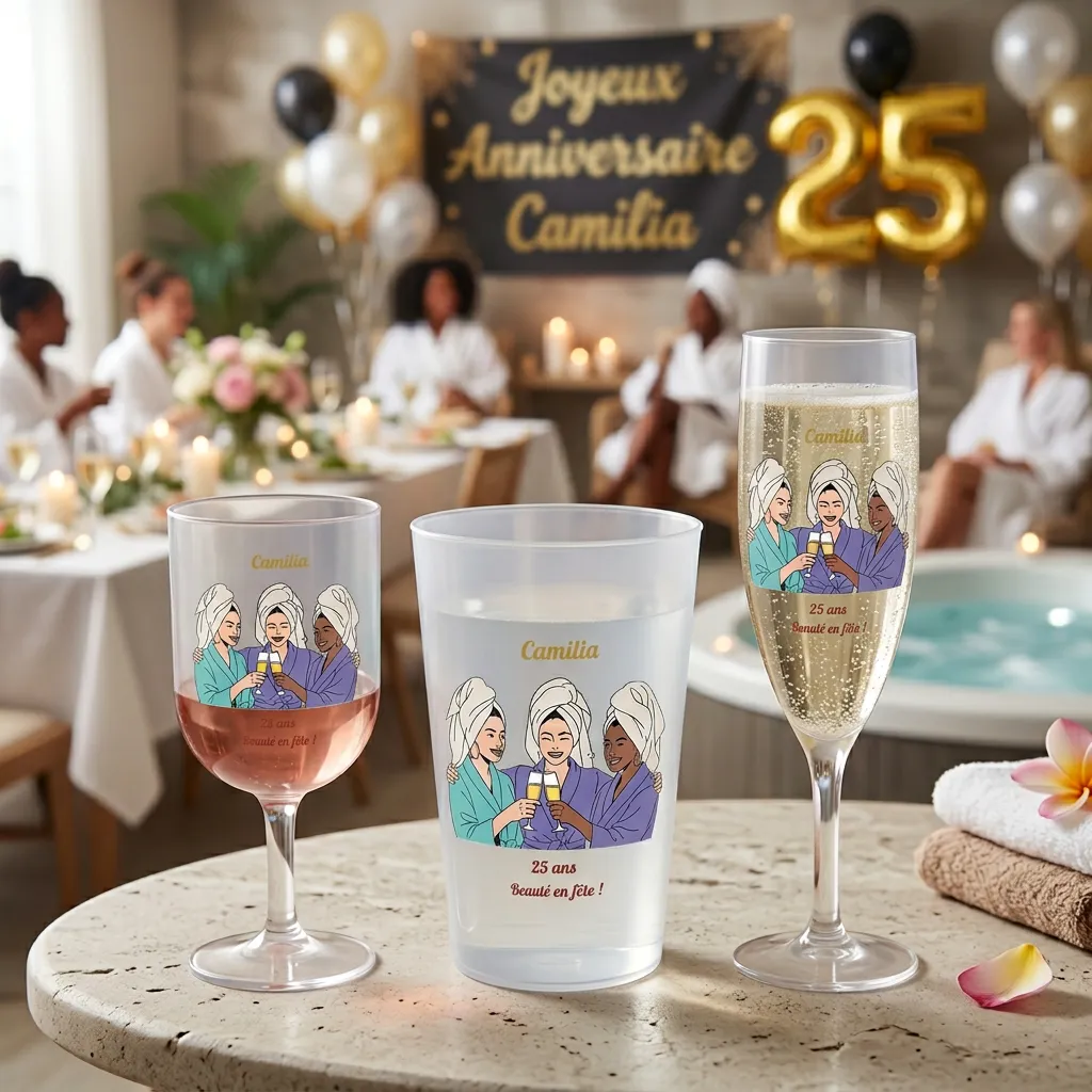 La tendance spa et beauty party pour les anniversaires filles est en plein essor ! Ce verre personnalisé anniversaire au thème soins beauté est parfait pour les petites et grandes filles qui aiment se chouchouter. Un cadeau original pour les birthday girls de 8 à 16 ans qui adorent prendre soin d'elles.
