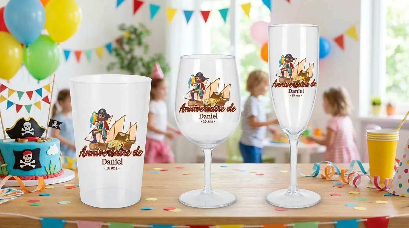 En route pour l'aventure ! Ce verre personnalisé anniversaire pirate transforme chaque table d'anniversaire garçon en navire de flibustiers. Tendance intemporelle pour les 4 à 10 ans, le thème pirate est synonyme de trésor, d'aventure et de fête épique. Un cadeau invité que les enfants garderont comme un trésor.